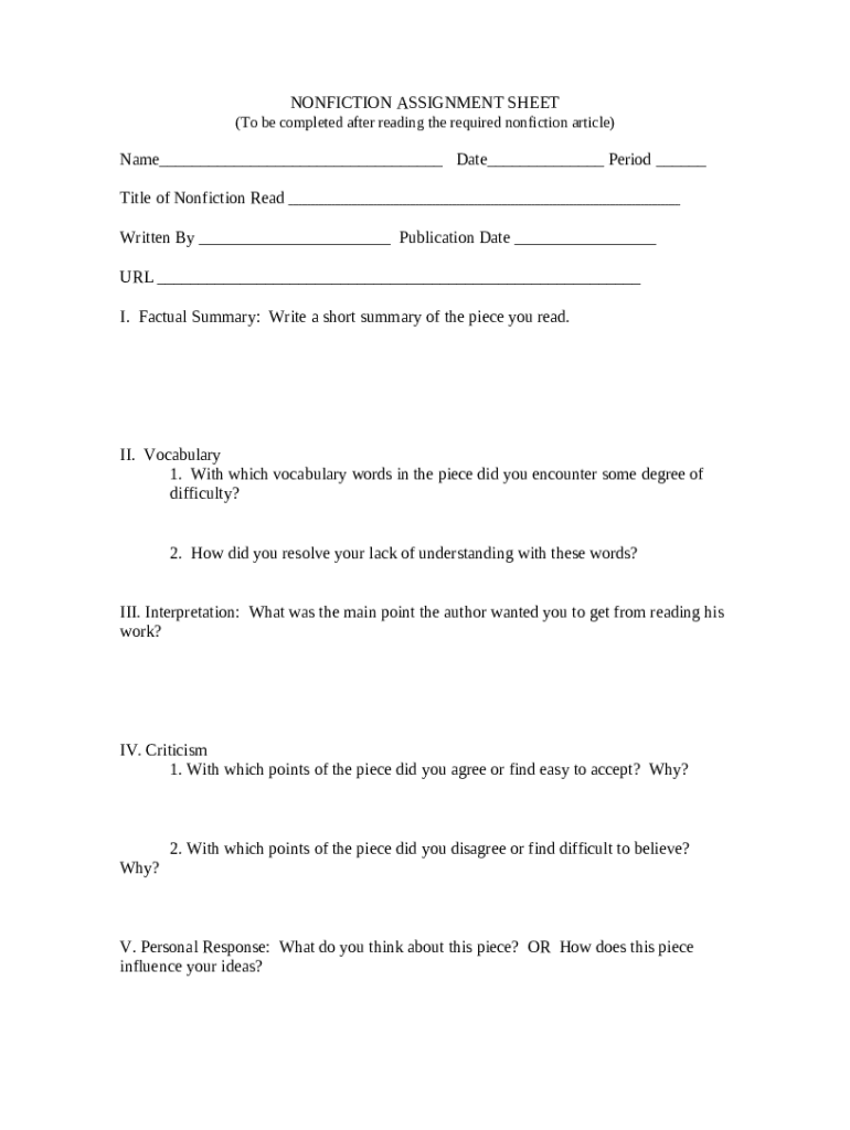 What is NONFICTION ASSIGNMENT SHEET - Name: Jen /15 ... Form?