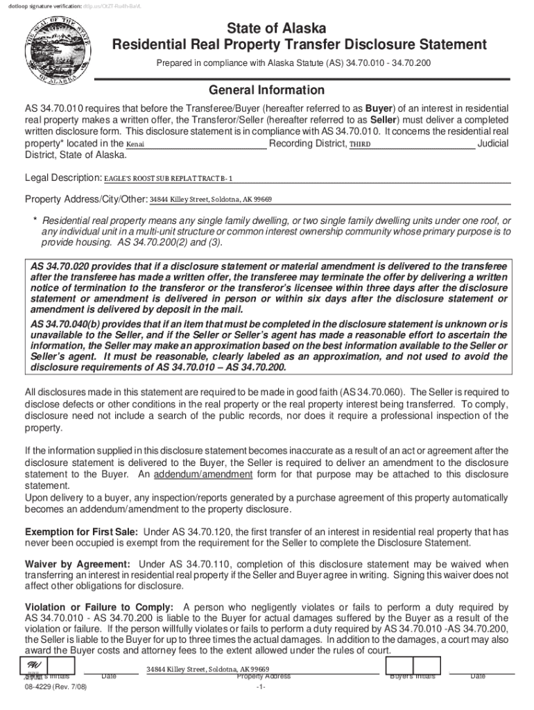 Dot loop signature verification: dtlp.us/OtZTRu4hBaVLState of Alaska Residential Real Property Transfer Disclosure Statement Prepared in compliance with Alaska Statute (AS) 34.70.010 34.70.200General