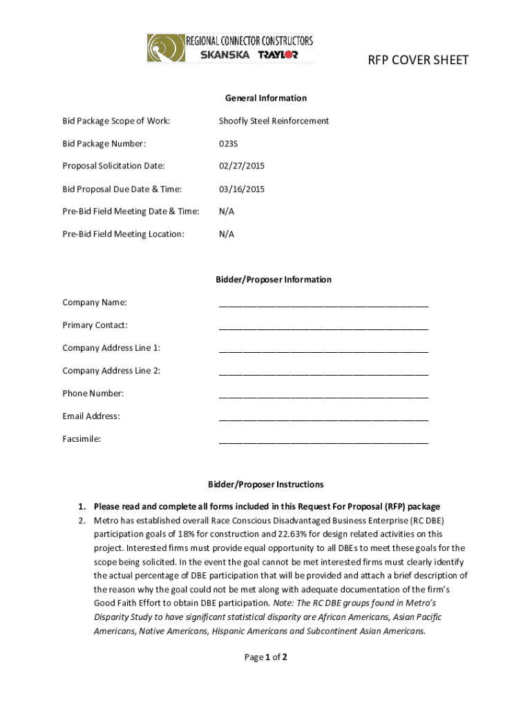 RFP COVER SHEET General Information Bid Package Scope of Work:Shoofly Steel ReinforcementBid Package Number:023SProposal Solicitation Date:02/27/2015Bid Proposal Due Date & Time:03/16/2015PreBid Field