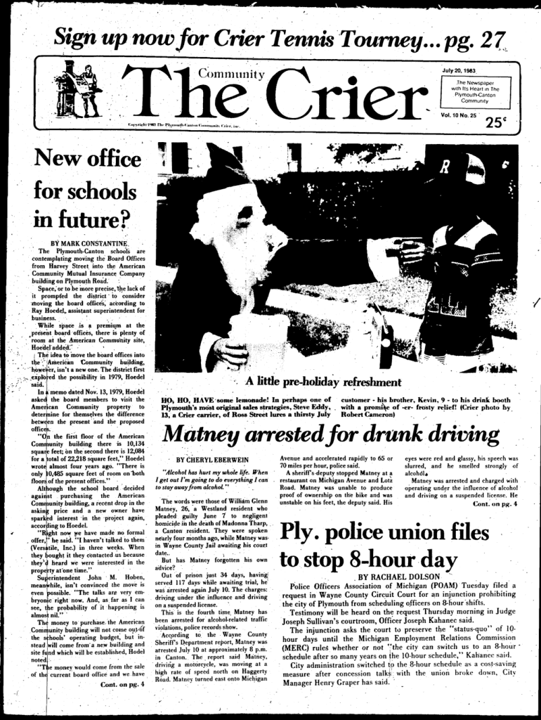Sign up now fo r Crier Tennis Tourney. ..pg. 27 Ju ly 20,1963. .The Newspaper with Its Heart in The PlyrnouthCanton CommunityVol. 10 No. 25I|%riulirI\'WUrh. I\'KiihuiiIiIaiilunl .iitmititilti I rit