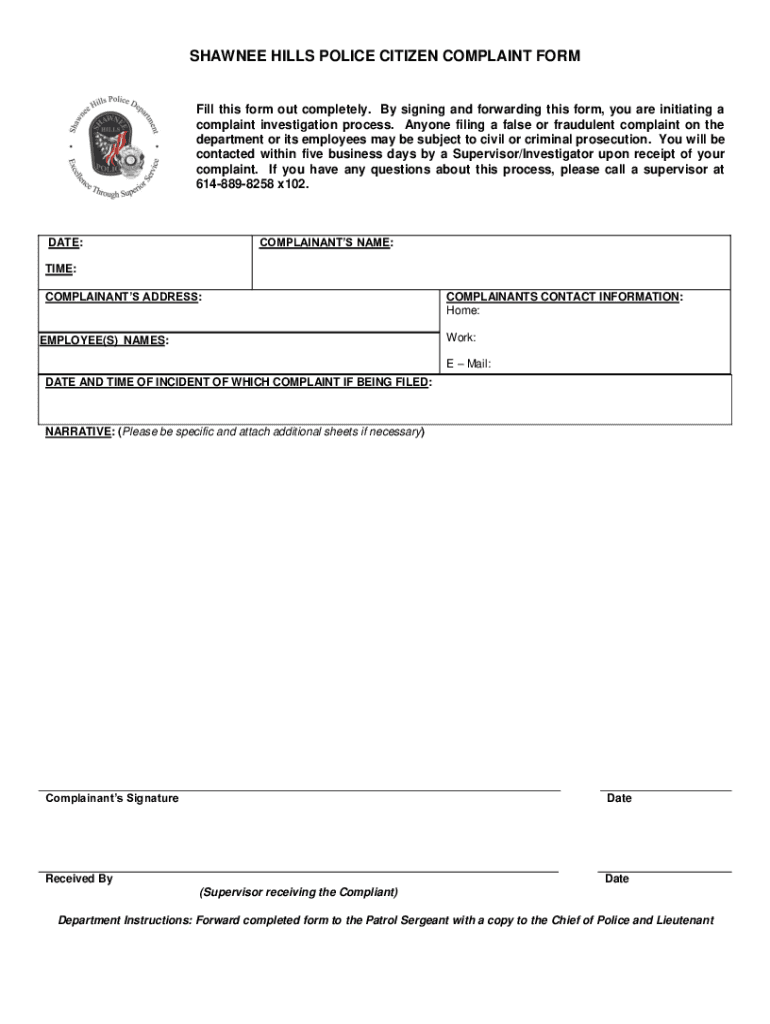 SHAWNEE HILLS POLICE CITIZEN COMPLAINT Formerly this form out completely. By signing and forwarding this form, you are initiating a