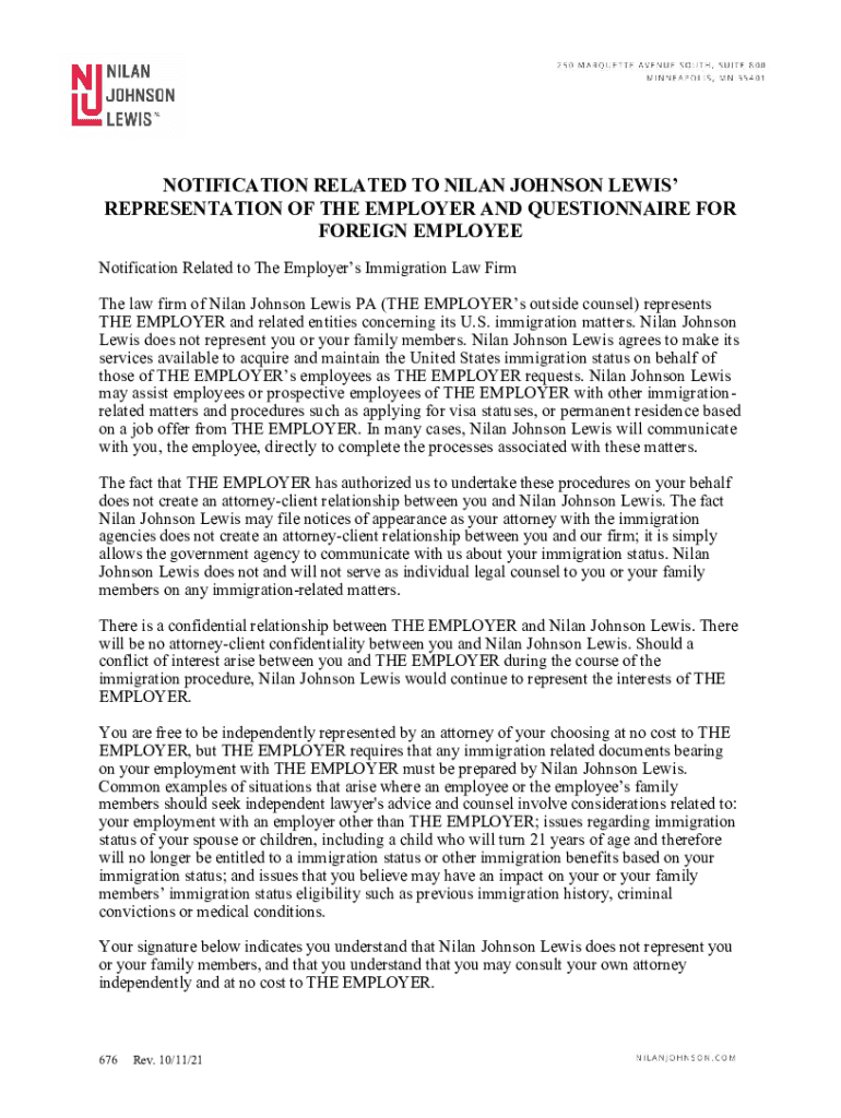 NOTIFICATION RELATED TO NILAN JOHNSON LEWIS REPRESENTATION OF THE EMPLOYER AND QUESTIONNAIRE FOR FOREIGN EMPLOYEE Notification Related to The Employers Immigration Law Firm The law firm of Nilan Johnson
