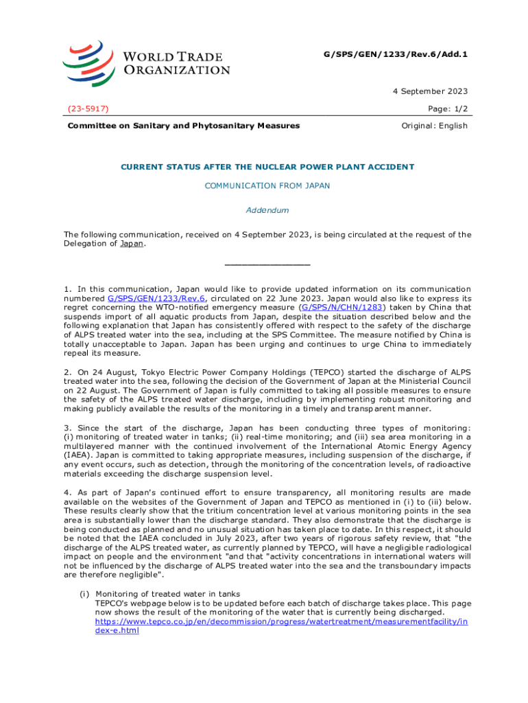 G/SPS/GEN/1233/Rev.6/Add.14 September 2023 (235917)Page: 1/2Committee on Sanitary and Phytosanitary MeasuresOriginal: EnglishCURRENT STATUS AFTER THE NUCLEAR POWER PLANT ACCIDENT COMMUNICATION FROM
