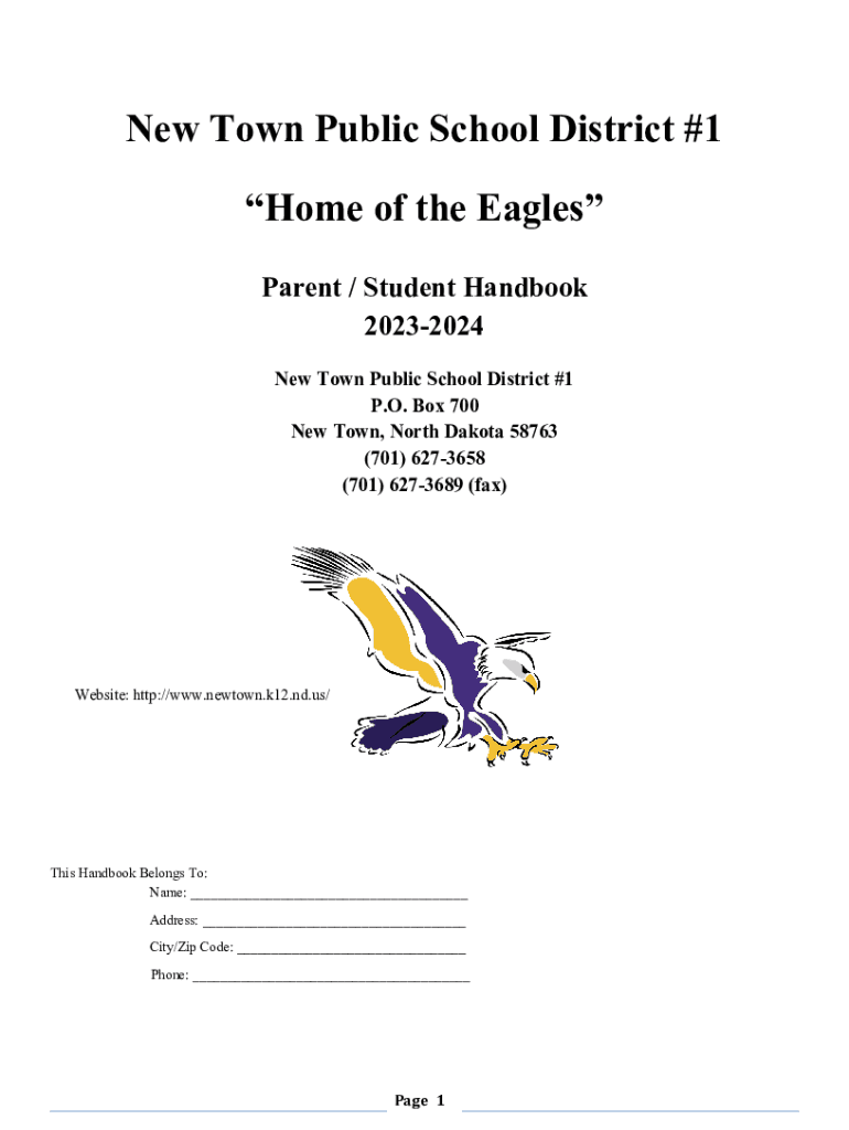 New Town Public School District #1 Home of the Eagles Parent / Student Handbook 20232024 New Town Public School District #1 P.O. Box 700 New Town, North Dakota 58763 (701) 6273658 (701) 6273689 (fax)Website: