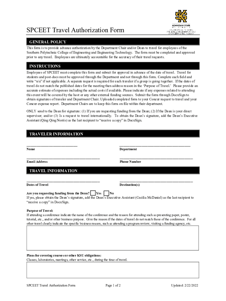 Get the free SPCEET Travel Authorization Form - engineering kennesaw