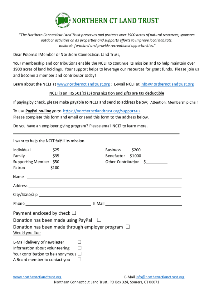 The Northern Connecficut Land Trust preserves and protects over 1900 acres of natural resources, sponsors outdoor acfivifies on its properfies and supports eorts to improve local habitats, maintain