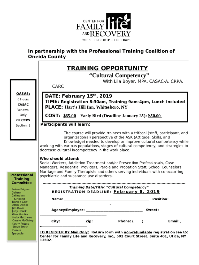 The Cultural Competency Registration is a fillable form in MS Word extension needed to be submitted to the required address to provide some information. It must be filled-out and signed, which can be done manually in hard copy, or by using a particular software such as PDFfiller. It lets you complete any PDF or Word document directly from your browser (no software requred), customize it depending on your purposes and put a legally-binding electronic signature. Right away after completion, user can send the Cultural Competency Registration to the relevant recipient, or multiple recipients via email or fax. The editable template is printable as well thanks to PDFfiller feature and options offered for printing out adjustment. Both in electronic and in hard copy, your form will have got neat and professional appearance. You may also save it as the template to use later, there's no need to create a new file over and over. All you need to do is to amend the ready template.