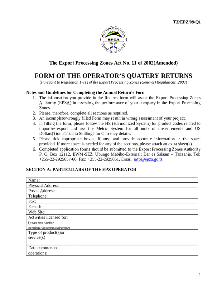 Instructions for the United Republic of Tanzania - Export Processing Zone Act, ... form