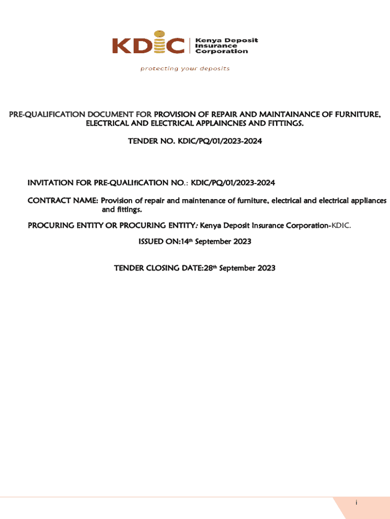 PREQUALIFICATION DOCUMENT FOR PROVISION OF REPAIR AND MAINTAINANCE OF FURNITURE, ELECTRICAL AND ELECTRICAL APPLAINCNES AND FITTINGS. TENDER NO. KDIC/PQ/01/20232024INVITATION FOR PREQUALICATION NO.: