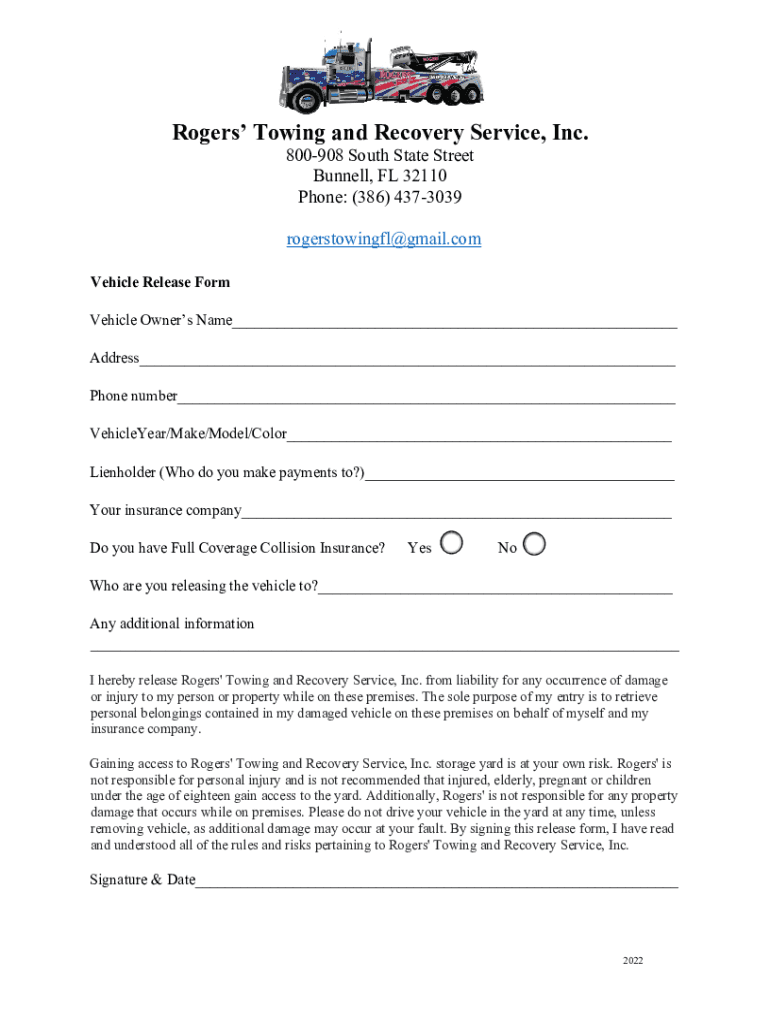 Rogers Towing and Recovery Service, Inc. 800908 South State Street Bunnell, FL 32110 Phone: (386) 4373039rogerstowingfl@gmail.com Vehicle Release Form Vehicle Owners Name___ Address___ Phone number___