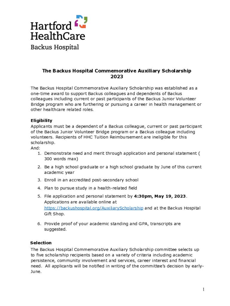 The Backus Hospital Commemorative Auxiliary Scholarship 2023 The Backus Hospital Commemorative Auxiliary Scholarship was established as a onetime award to support Backus colleagues and dependents