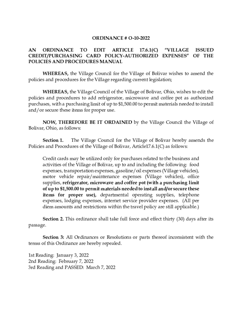 ORDINANCE # O102022 AN ORDINANCE TO EDIT ARTICLE 17.6.1(C) VILLAGE ISSUED CREDIT/PURCHASING CARD POLICYAUTHORIZED EXPENSES OF THE POLICIES AND PROCEDURES MANUAL WHEREAS, the Village Council for the
