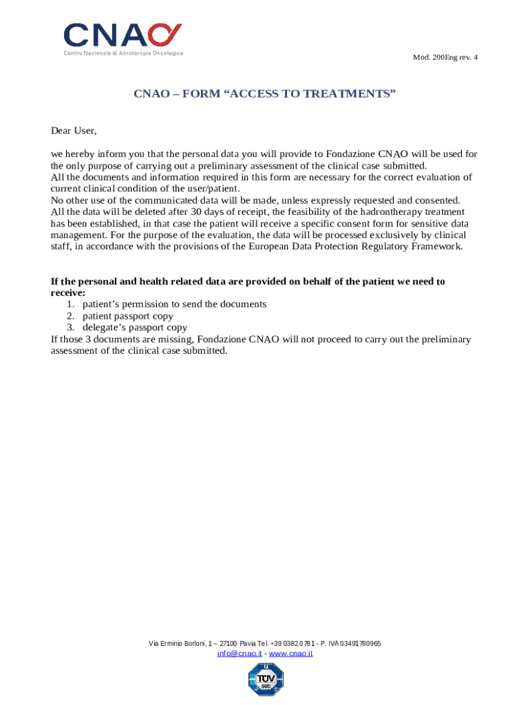 Instructions for the we hereby in you that the personal data you will provide to Fondazione CNAO will be used for the only purpose of carrying out a preliminary assessment of the clinical case submitted form