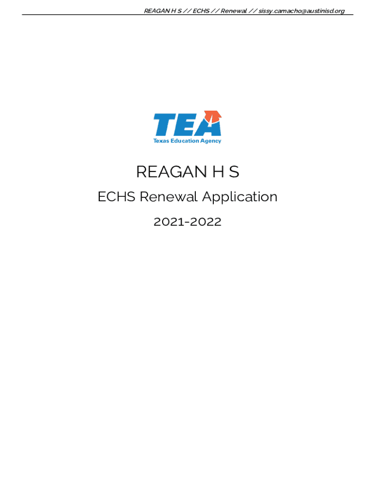 REAGAN H S // ECHS // Renewal // sissy.camacho@austinisd.orgREAGAN H S ECHS Renewal Application 20212022REAGAN H S // ECHS // Renewal // sissy.camacho@austinisd.orgContents Background Contacts Narratives