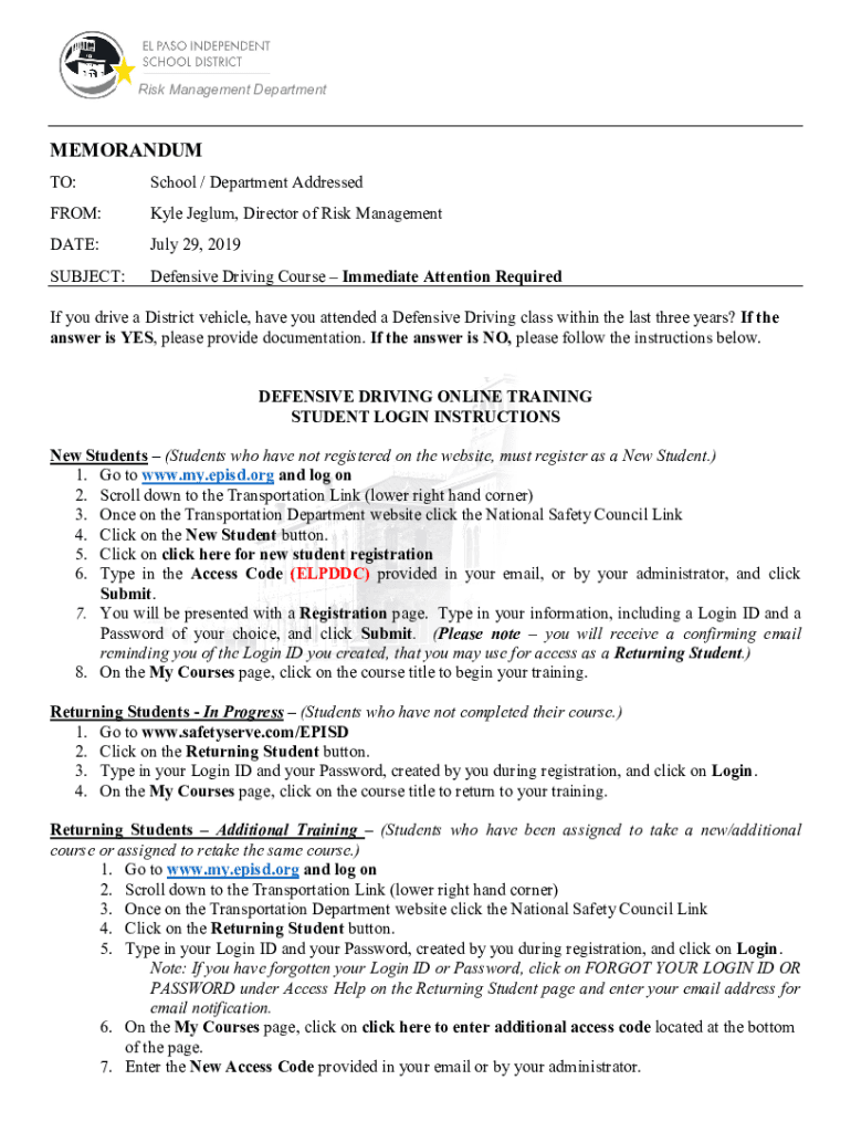 Risk Management DepartmentMEMORANDUM TO:School / Department AddressedFROM:Kyle Jeglum, Director of Risk ManagementDATE:July 29, 2019SUBJECT:Defensive Driving Course Immediate Attention RequiredIf