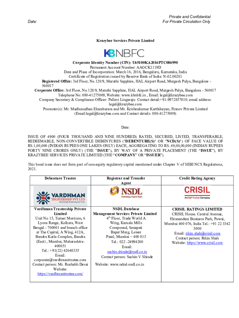 Private and Confidential For Private Circulation OnlyDate:Krazybee Services Private LimitedCorporate Identity Number (CIN): U65100KA2016PTC086990 Permanent Account Number: AAGCK1119D Date and Place