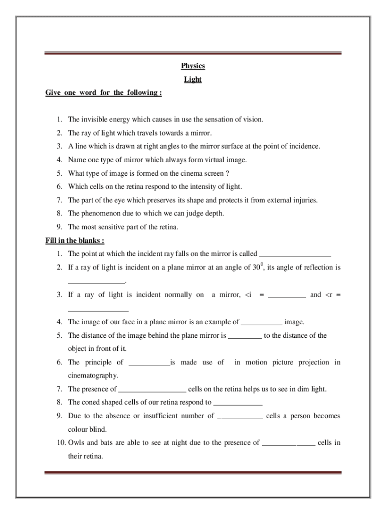 Physics Light Give one word for the following :1. The invisible energy which causes in use the sensation of vision. 2. The ray of light which travels towards a mirror. 3. A line which is drawn at