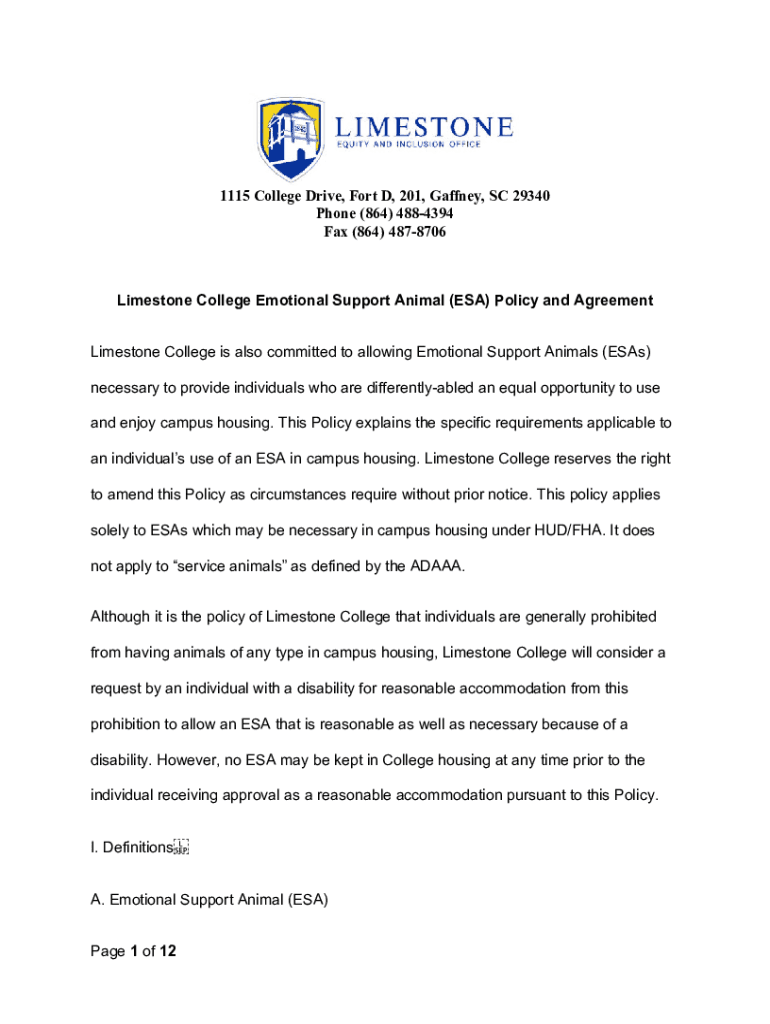 1115 College Drive, Fort D, 201, Gaffney, SC 29340 Phone (864) 4884394 Fax (864) 4878706Limestone College Emotional Support Animal (ESA) Policy and Agreement Limestone College is also committed to