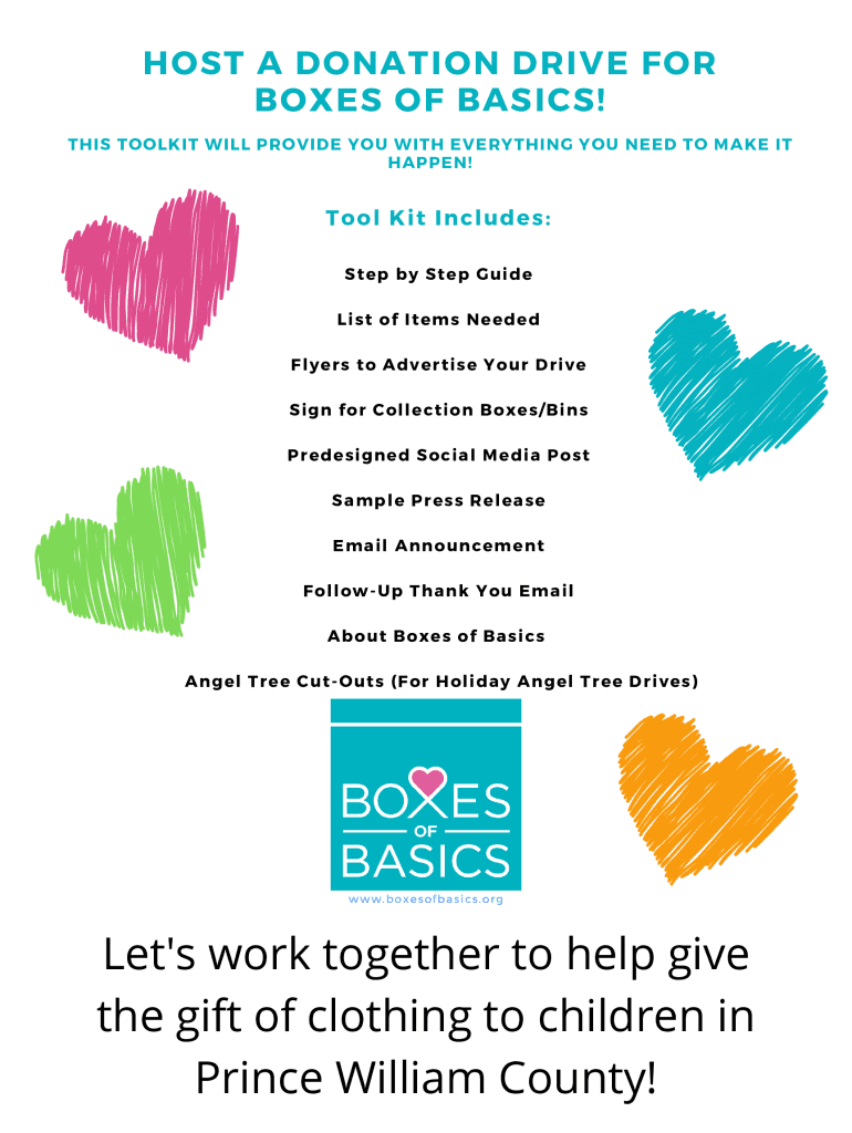 HOST A DONATION DRIVE FOR BOXES OF BASICS!THIS TOOLKIT WILL PROVIDE YOU WITH EVERYTHING YOU NEED TO MAKE IT HAPPEN!Tool Kit Includes:Step by Step GuideList of Items NeededFlyers to Advertise Your