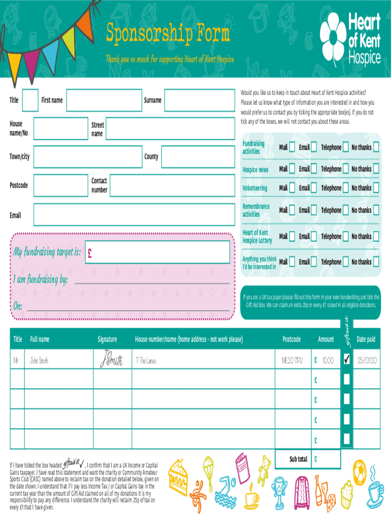 Sponsorship Form Thank you so much for supporting Heart of Kent HospiceTitleFirst nameSurnameHouse name/NoStreet nameTown/cityCounty Contact numberPostcode EmailMy fundraising target is:I am fundraising