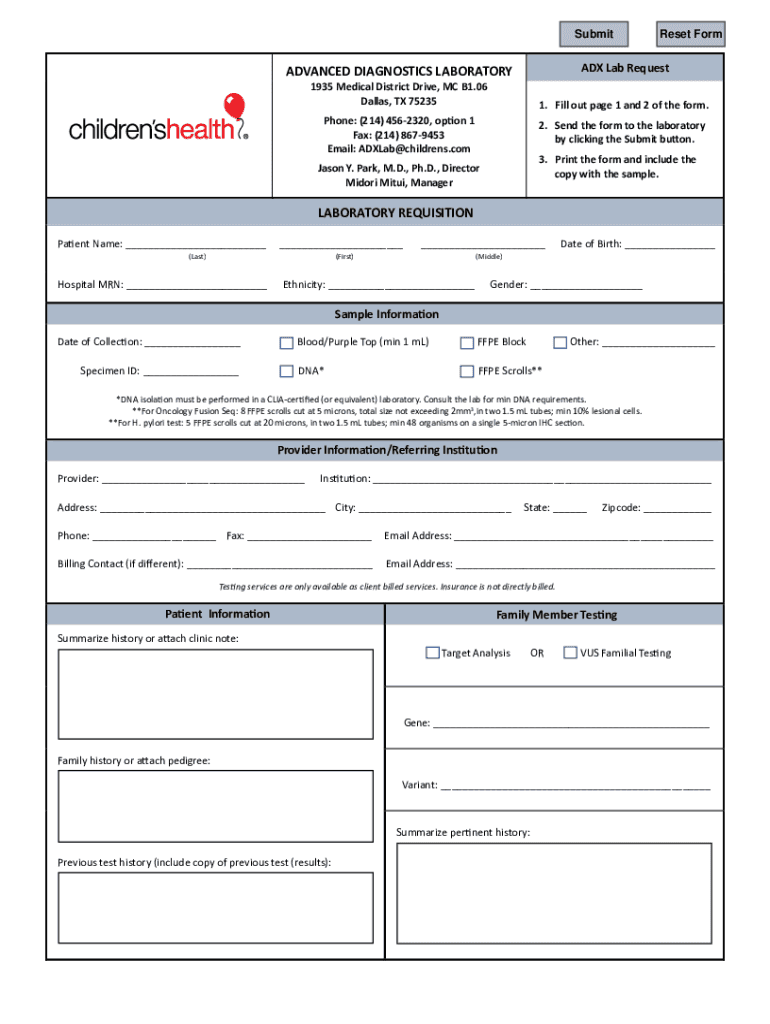 SubmitReset FormADX Lab RequestADVANCED DIAGNOSTICS LABORATORY 1935 Medical District Drive, MC B1.06 Dallas, TX 752351. Fill out page 1 and 2 of the form.Phone: (214) 4562320, opon 1 Fax: (214) 8679453