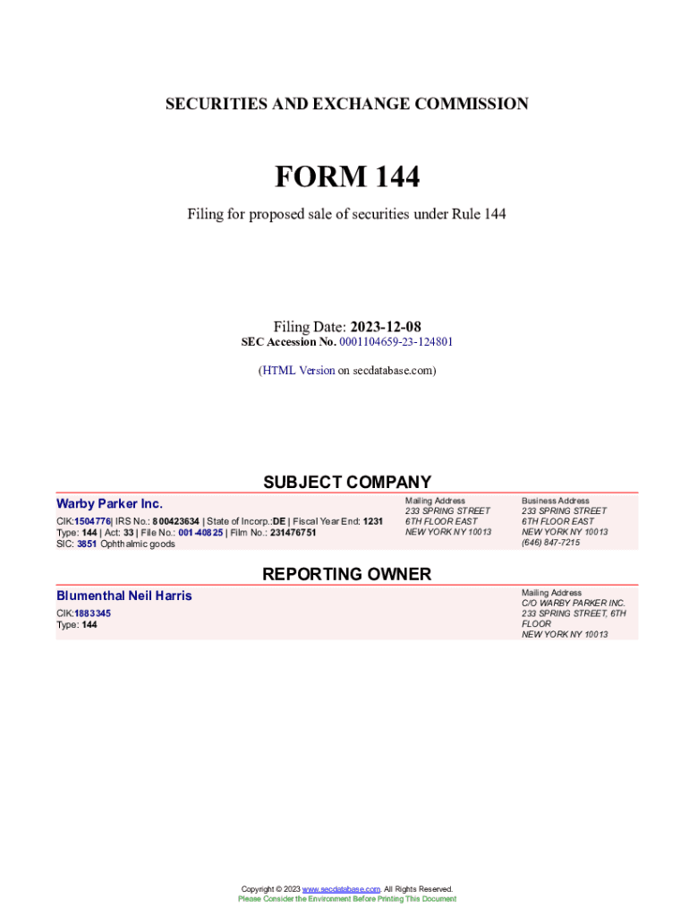Get the free WRBY - Form 144 - Report of proposed sale of securities