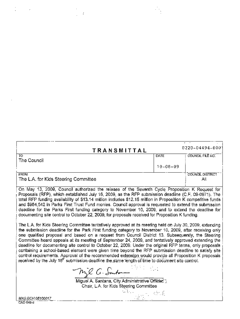 022004494000TRANSMITTAL DATETOCOUNCIL FILE NO.The Council 100809 FROMCOUNCIL DISTRICTThe L.A. for Kids Steering CommitteeAllOn May 13, 2009, Council authorized the release of the Seventh Cycle Proposition