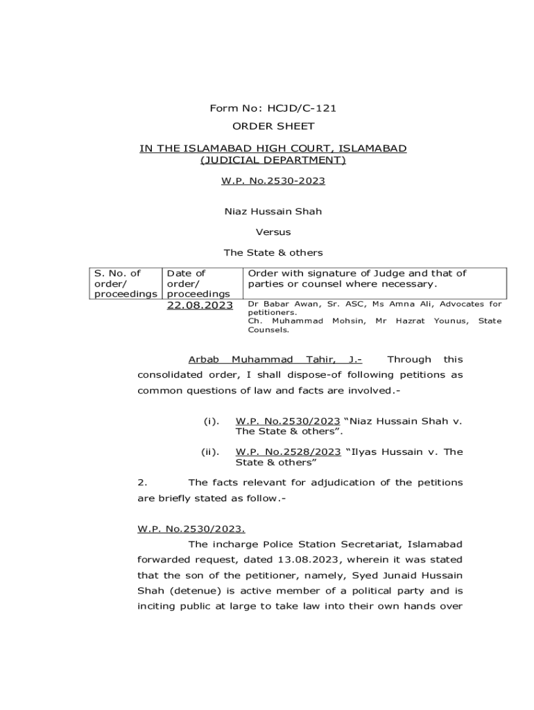 Form No: HCJD/C121 ORDER SHEET IN THE ISLAMABAD HIGH COURT, ISLAMABAD (JUDICIAL DEPARTMENT) W.P. No.25302023 Niaz Hussain Shah Versus The State & others S. No. of Date of order/ order/ proceedings