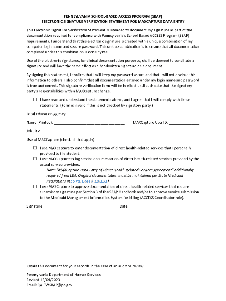ELECTRONIC SIGNATURE VERIFICATION STATEMENT FOR CAPTURE DATA ENTRY