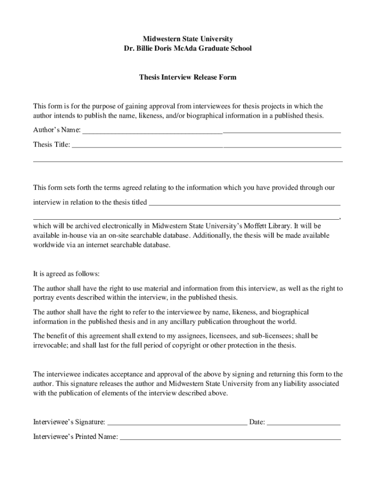 Dr. Billie Doris McAdam Graduate SchoolThesis Interview Release Forms form is for the purpose of gaining approval from interviewees for thesis projects in which the