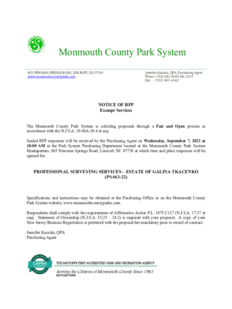 Monmouth County Park System 805 NEWMAN SPRINGS ROAD, LINCROFT, NJ 07738 www.monmouthcountyparks.comJennifer Kaczala, QPA, Purchasing Agent Phone: (732) 8424000 Ext. 4217 Fax: (732) 8424162NOTICE OF
