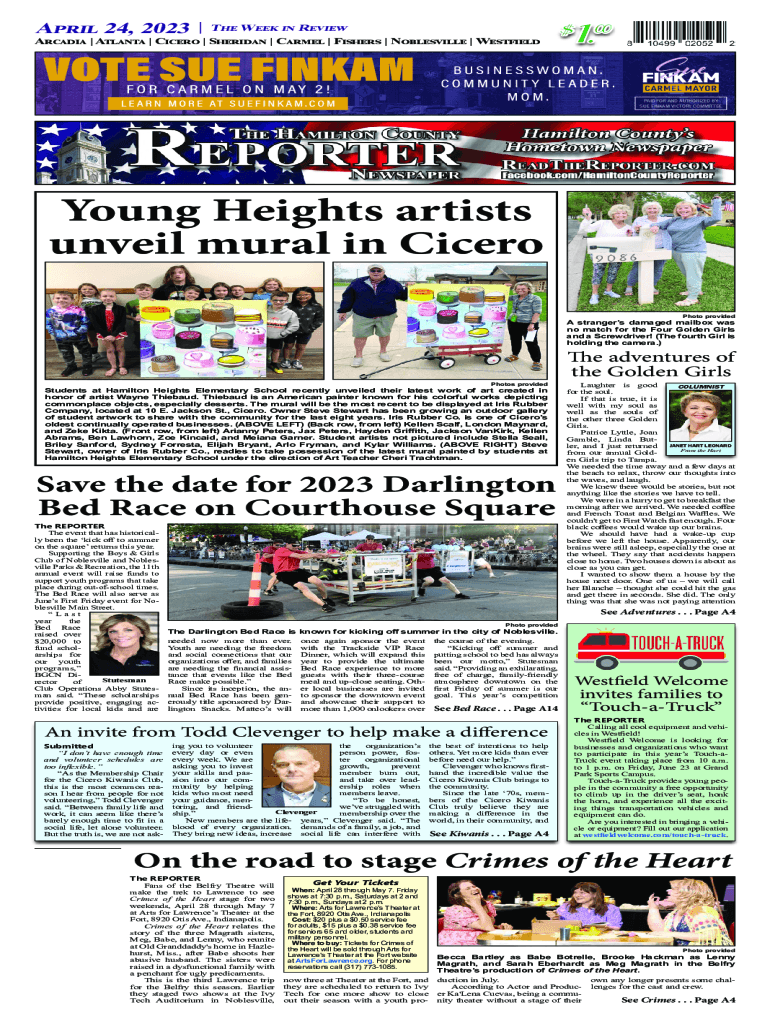 April 24, 2024 | The Week in Review Arcadia | Atlanta | Cicero | Sheridan | Carmel | Fishers | Noblesville | Westfield1.$ 00PAID FOR AND AUTHORIZED BY