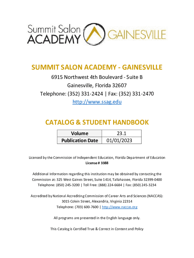 SUMMIT SALON ACADEMY GAINESVILLE 6915 Northwest 4th Boulevard Suite B Gainesville, Florida 32607 Telephone: (352) 3312424 | Fax: (352) 3312470 http://www.ssag.eduCATALOG & STUDENT HANDBOOK Volume