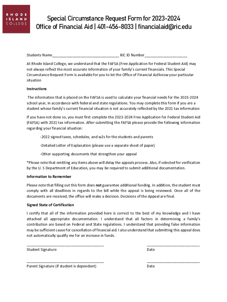 Special Circumstance Request Form for 20232024 Office of Financial Aid | 4014568033 | financialaid@ric.eduStudents Name___ RIC ID Number___ At Rhode Island College, we understand that the FAFSA (Free