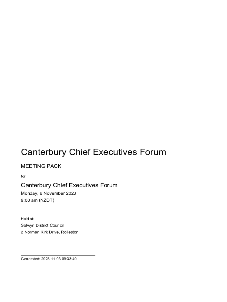 Canterbury Chief Executives Forum MEETING PACK forCanterbury Chief Executives Forum Monday, 6 November 2023 9:00 am (NZDT)Held at:Selwyn District Council 2 Norman Kirk Drive, RollestonGenerated: 20231103