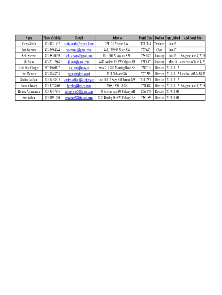 Get the free Name Phone (Mobile) E-mail Address Postal Code Position Date ... - ckc calgaryfounda...
