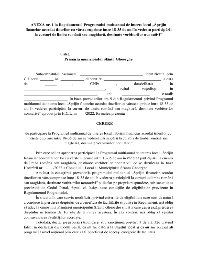 ANEXA nr. 1 la Regulamentul Programului multianual de interes local Sprijin financiar acordat tinerilor cu vrste cuprinse ntre 1835 de ani n vederea participrii la cursuri de limba romn sau maghiar,