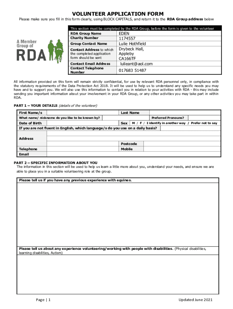 VOLUNTEER APPLICATION FORM Please make sure you fill in this form clearly, using BLOCK CAPITALS, and return it to the RDA Group address below This section must be completed by the RDA Group, before