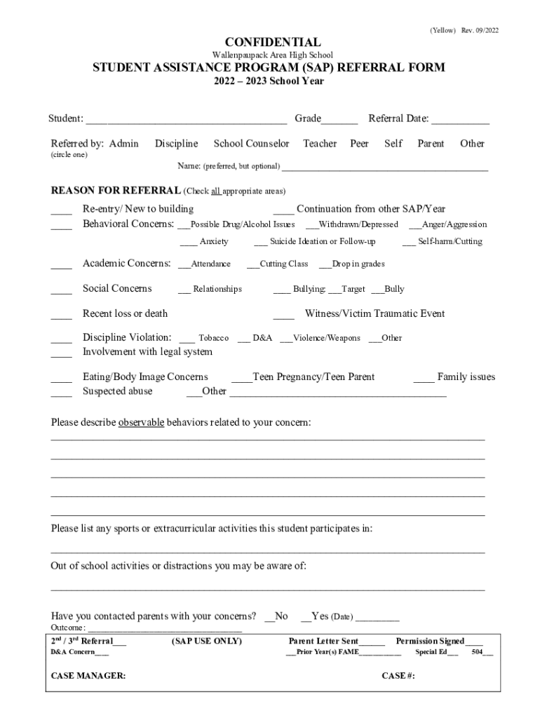 (Yellow) Rev. 09/2022CONFIDENTIALWallenpaupack Area High SchoolSTUDENT ASSISTANCE PROGRAM (SAP) REFERRAL FORM 2022 2023 School YearStudent: ___ Grade___ Referred by: Admin (circle one)DisciplineSchool