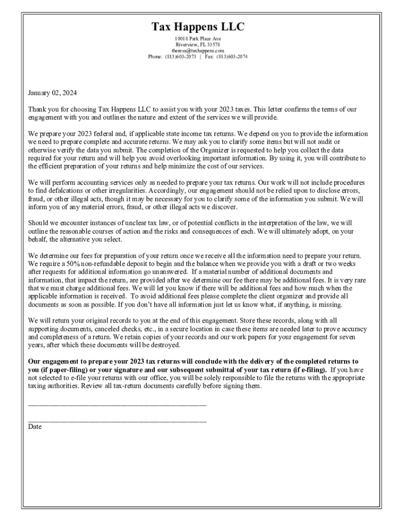 Tax Happens LLC 10018 Park Place Ave Riverview, FL 33578 theresa@taxhappens.com Phone: (813)6032073 | Fax: (813)6032074January 02, 2024 Thank you for choosing Tax Happens LLC to assist you with your