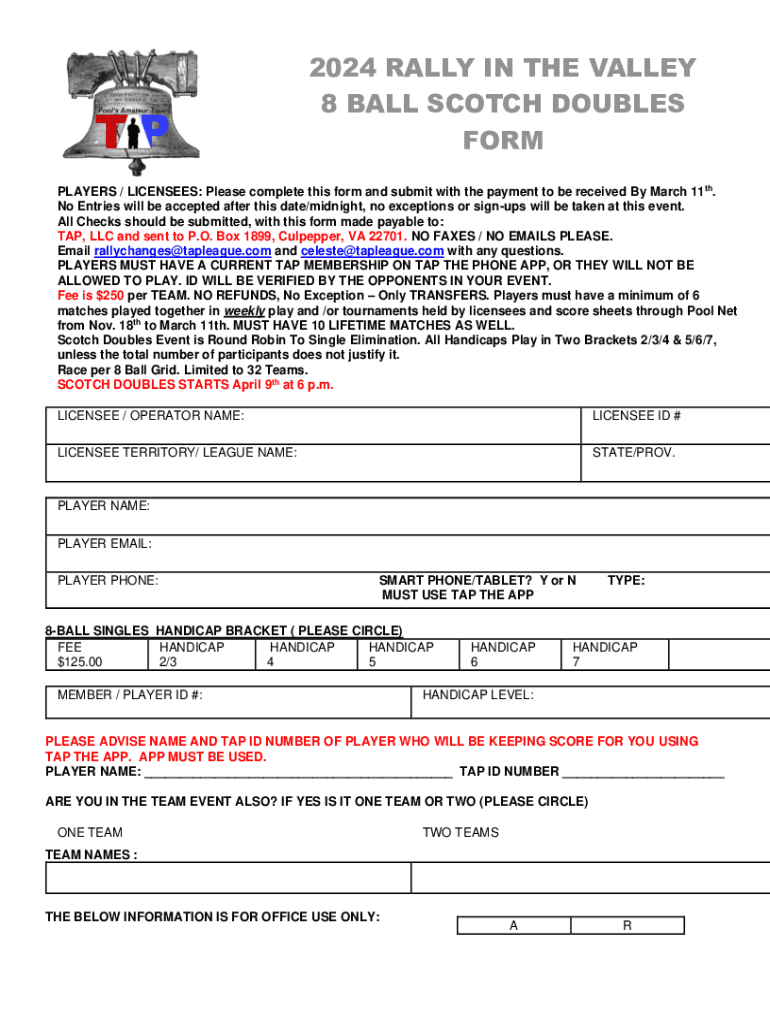 2024 RALLY IN THE VALLEY 8 BALL SCOTCH DOUBLES FORM PLAYERS / LICENSEES: Please complete this form and submit with the payment to be received By March 11th. No Entries will be accepted after this