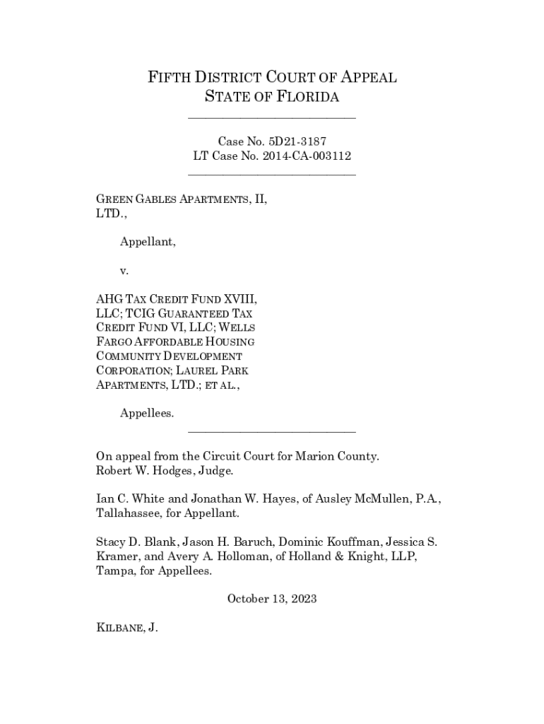 FIFTH DISTRICT COURT OF APPEAL STATE OF FLORIDA ___ Case No. 5D213187 LT Case No. 2014CA003112 ___ GREEN GABLES APARTMENTS, II, LTD., Appellant, v. AHG TAX CREDIT FUND XVIII, LLC; TCIG GUARANTEED