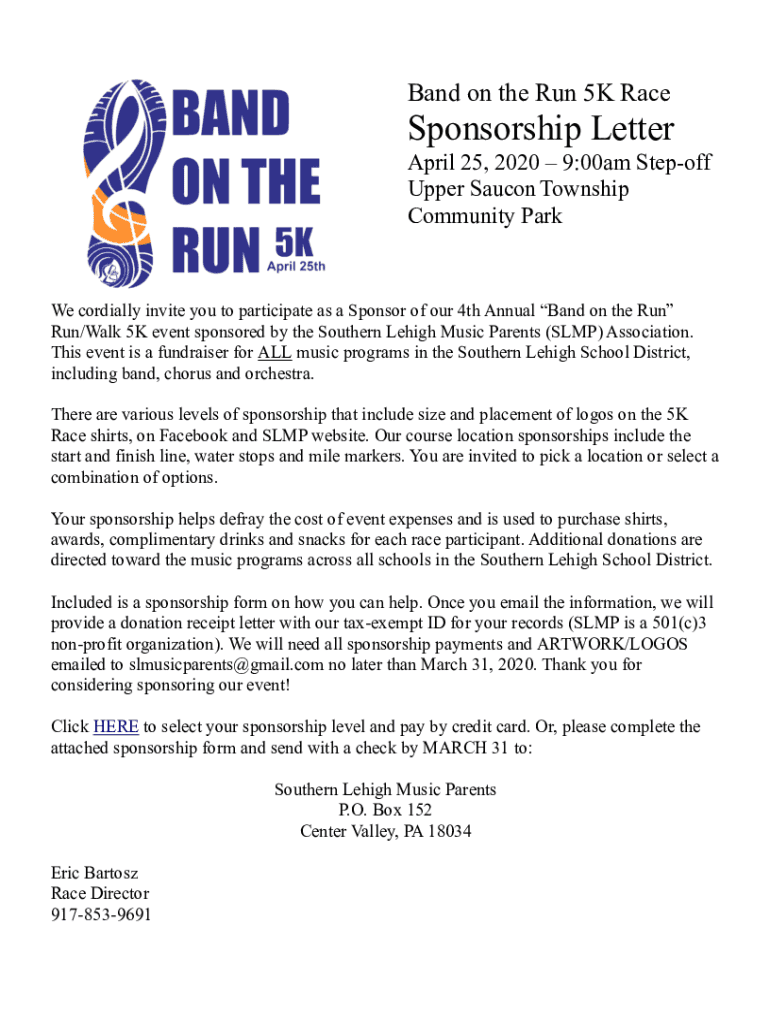 Band on the Run 5K RaceSponsorship Letter April 25, 2020 9:00am Stepoff Upper Saucon Township Community ParkWe cordially invite you to participate as a Sponsor of our 4th Annual Band on the Run Run/Walk