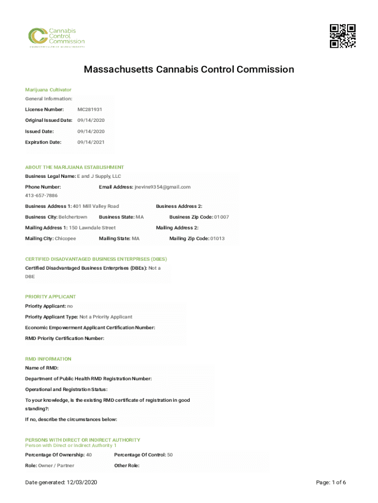 Massachusetts Cannabis Control Commission Marijuana Cultivator General Information: License Number:MC281931Original Issued Date: 09/14/2020 Issued Date:09/14/2020Expiration Date:09/14/2021ABOUT THE