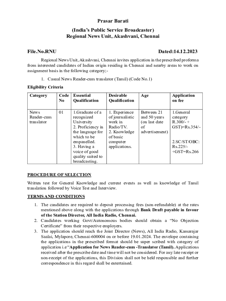 Prasar Barati (Indias Public Service Broadcaster) Regional News Unit, Akashvani, Chennai File.No.RNUDated:14.12.2023Regional News Unit, Akashvani, Chennai invites application in the prescribed proforma