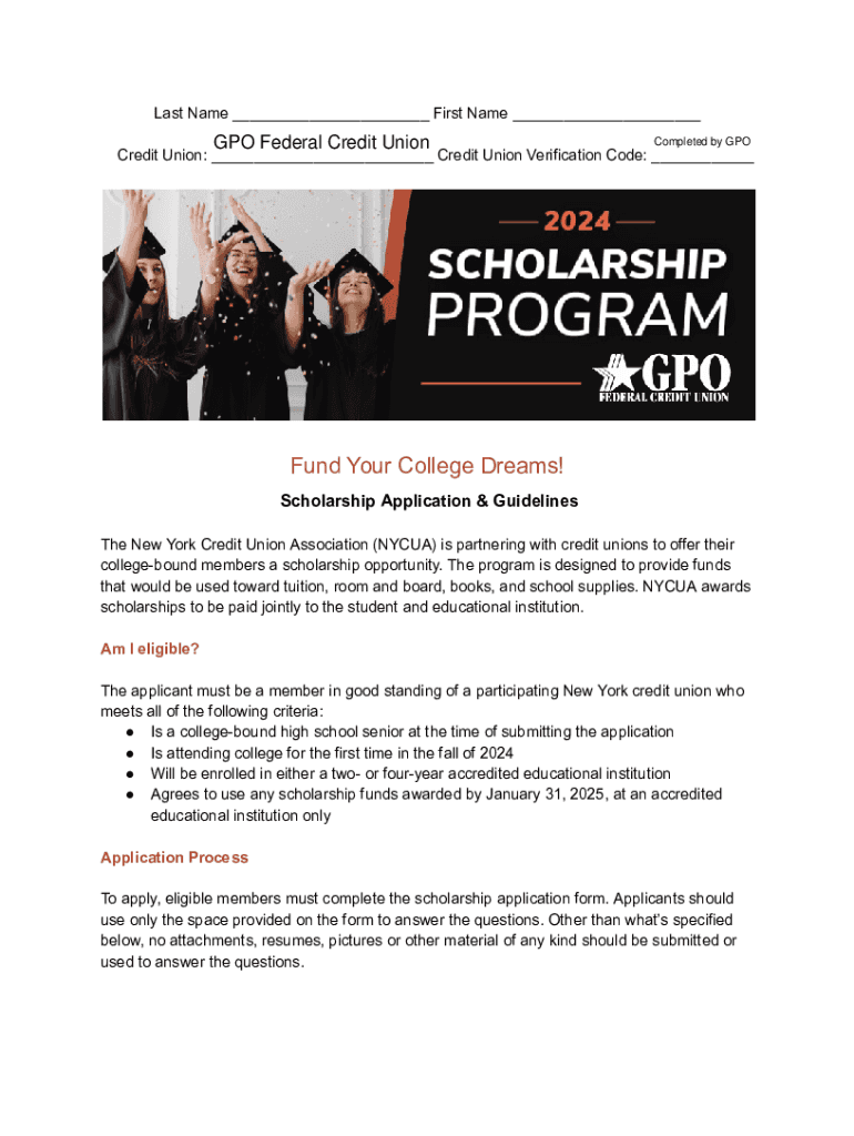 Last Name ___ First Name ___GPO Federal Credit UnionCompleted by GPOCredit Union: ___ Credit Union Verification Code: ___Fund Your College Dreams! Scholarship Application & Guidelines The New York