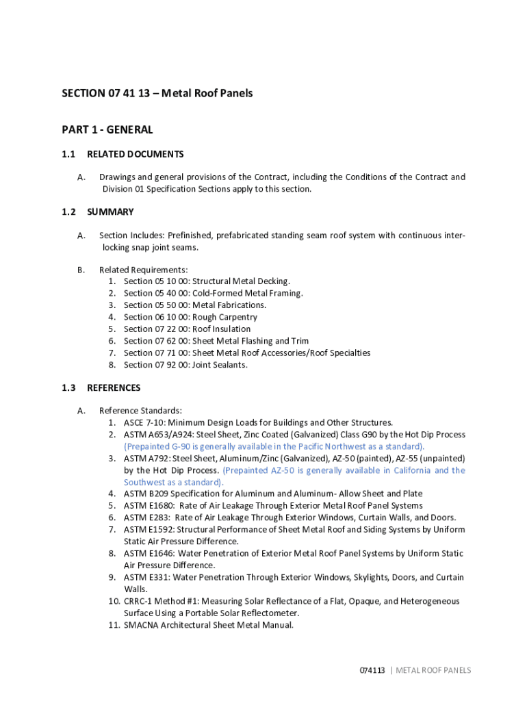 SECTION 07 41 13 Metal Roof Panels PART 1 GENERAL 1.1RELATED DOCUMENTS A.1.2Drawings and general provisions of the Contract, including the Conditions of the Contract and Division 01 Specification