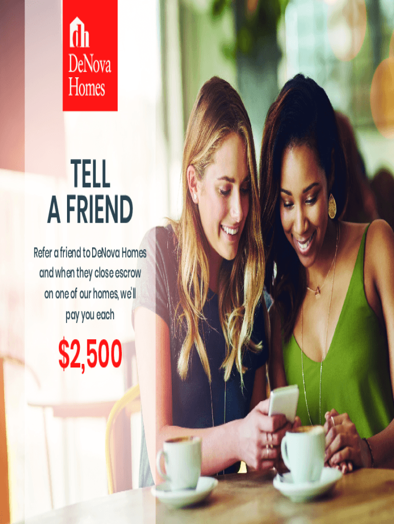 TELL A FRIENDRefer a friend to DeNova Homes and when they close escrow on one of our homes, well pay you each$2,500nyone can refer a friend to DeNova Homeshome ownership is not required! Simply fill