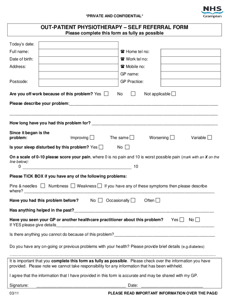 *PRIVATE AND CONFIDENTIAL*OUTPATIENT PHYSIOTHERAPY SELF REFERRAL FORM Please complete this form as fully as possible Todays date: Full name: Home tel no:Date of birth: Work tel no:Address: Mobile