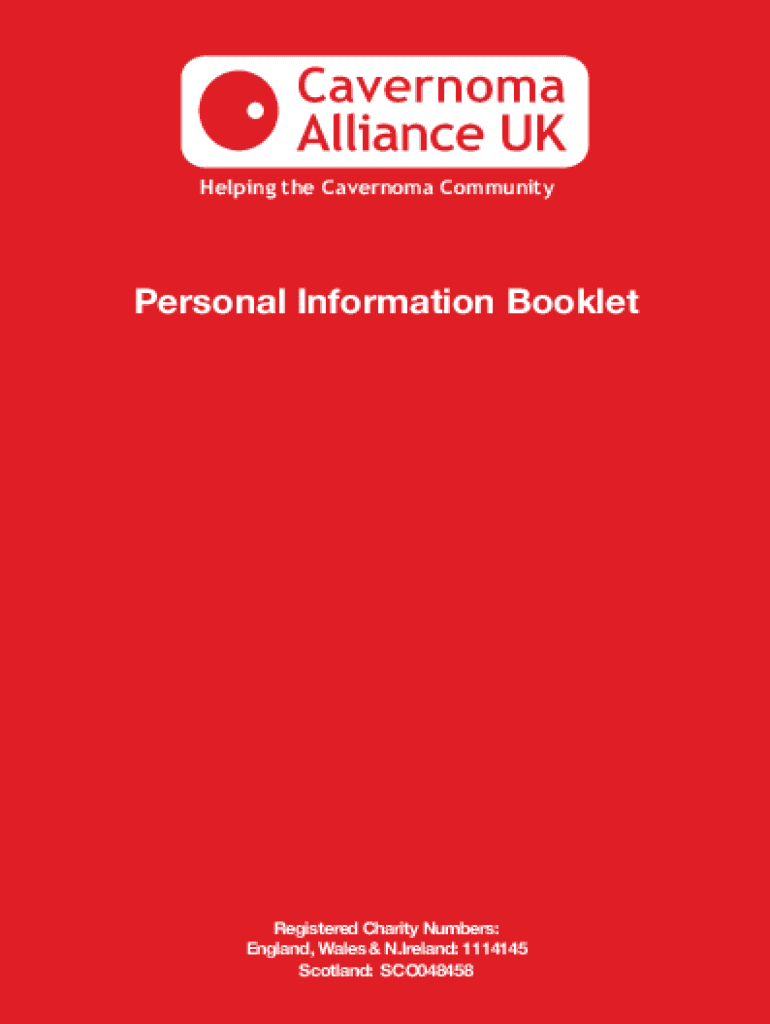 Helping the Cavernoma CommunityPersonal Information BookletRegistered Charity Numbers: England, Wales & N.Ireland: 1114145 Scotland: SCO048458General information on cavernoma A cavernoma looks like